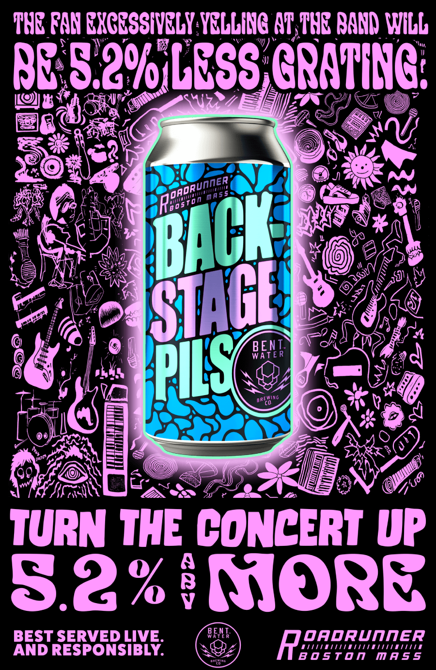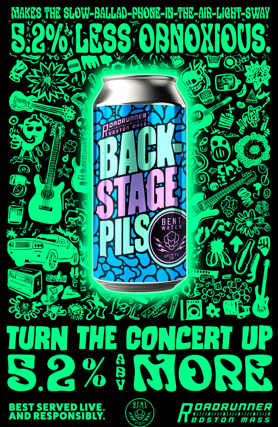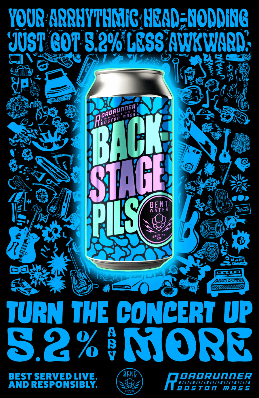 Next, you have Bent Water Brewing’s poster and packaging for Backstage Pils. It goes big and bold to channel the energy of live music that is noisy and slightly overwhelming.
