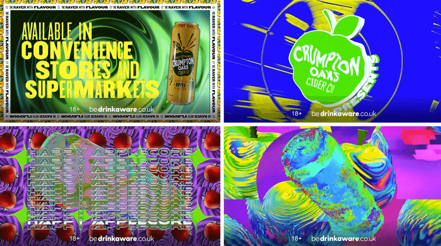 This campaign doesn’t try to be calm or collected because Crumpton Oaks leans all the way into 90s nostalgia with bold colors and eye-popping neon graphics. The cider brand teamed up with DJ Hixxy and MC Whizzkid to create a rave-inspired celebration of chaotic joy, from fly posters to projection.
