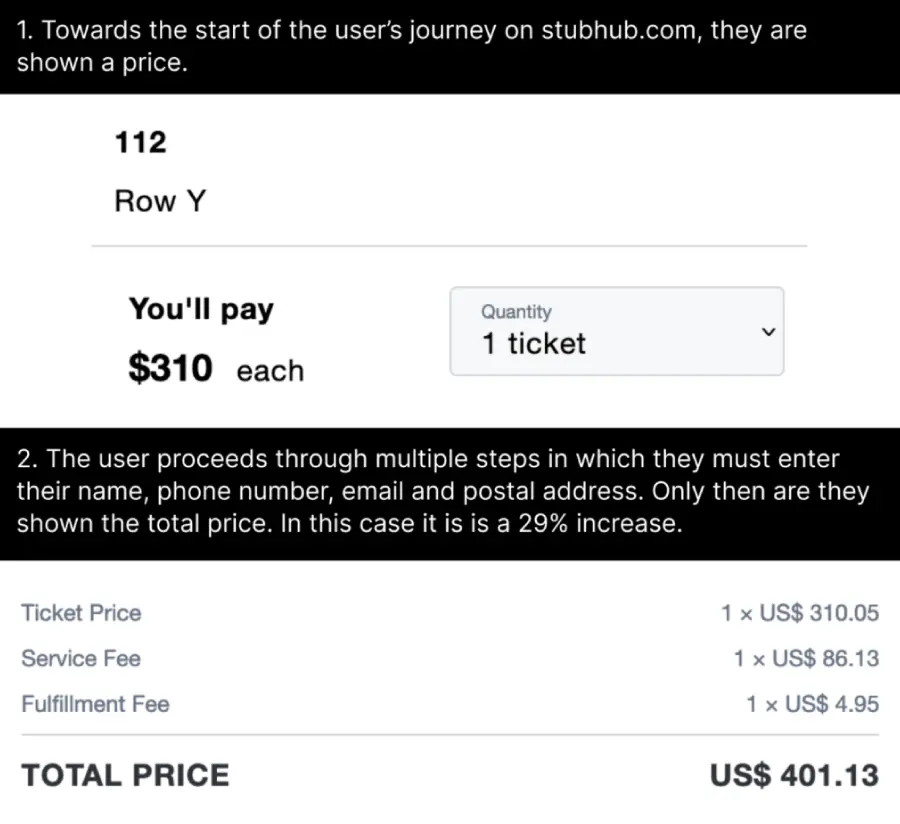Design ethics hidden costs example by StubHub. Source: Deceptive Patterns