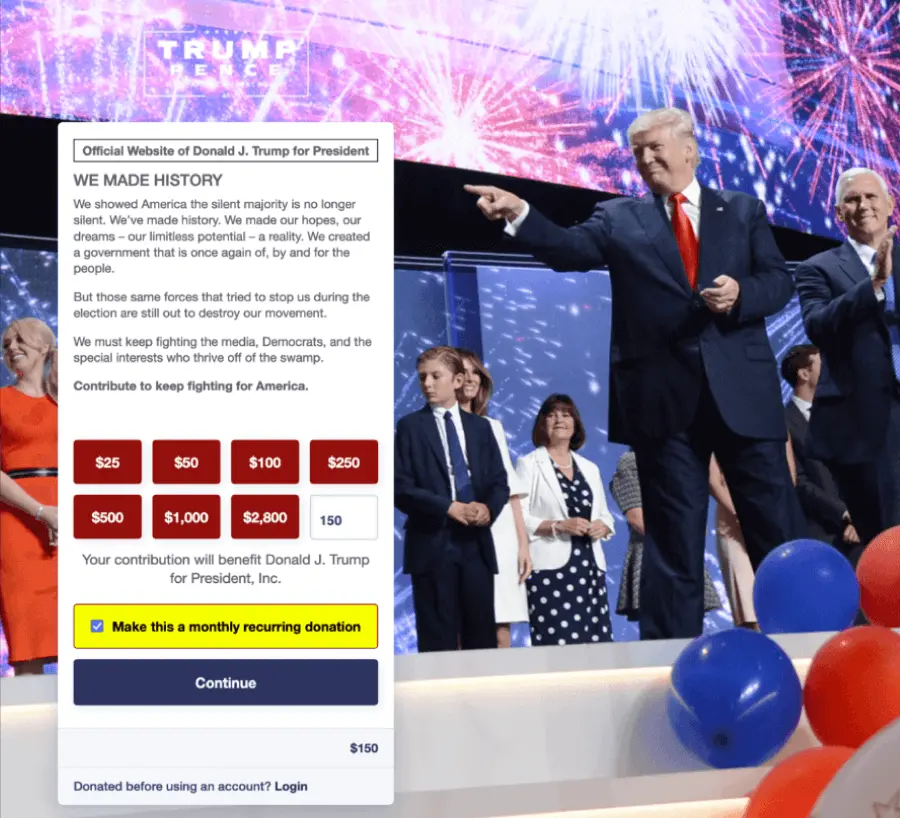 Preselection example by Donald J Trump for President Campaign. Source: Deceptive Patterns