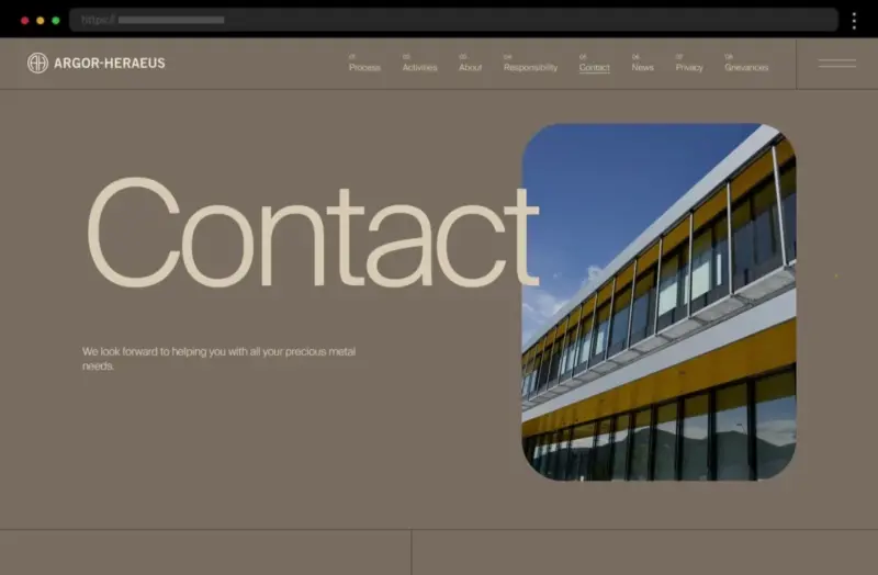 Argor Heraeus’s contact page feels polished and reliable, featuring a smart drop-down form that directs inquiries to the right department and complete contact details for accessibility.