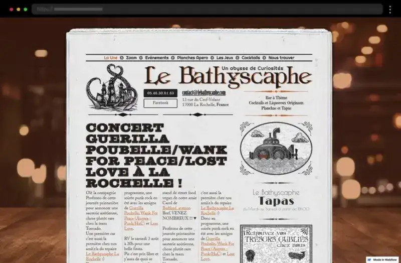Bathyscaphe’s bar and restaurant site is presented in a newspaper style blending bold fonts and retro imagery to create a vintage yet sophisticated typographic experience.
