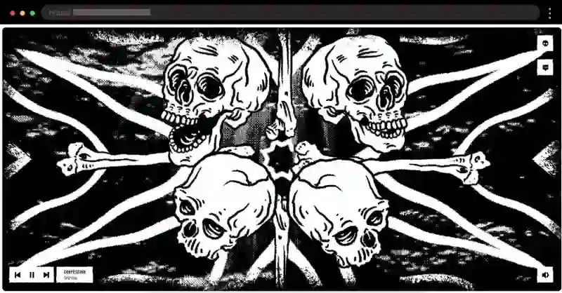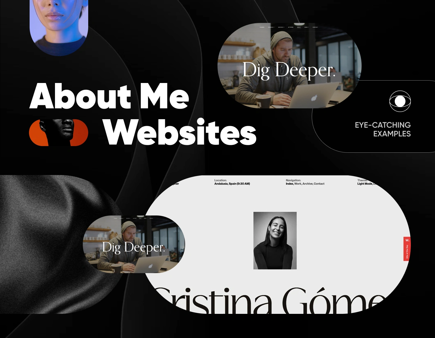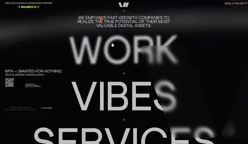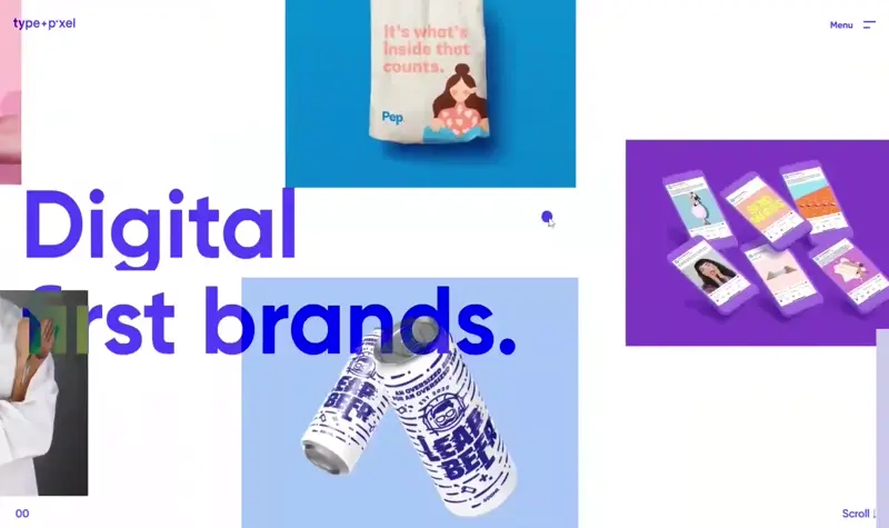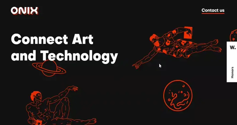 Sacred Pact’s WordPress portfolio website example combines scattered images, custom cursors, and hover effects for an interactive and visually dynamic showcase.