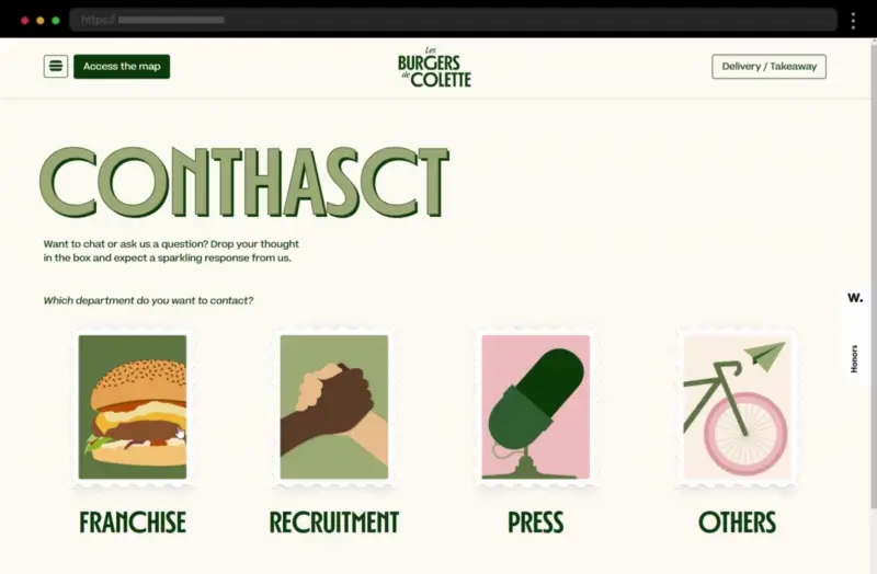Les Burgers de Colette’s contact page bursts with energy. Playful icons, postcard-style forms, and social media links make reaching out feel casual and friendly.