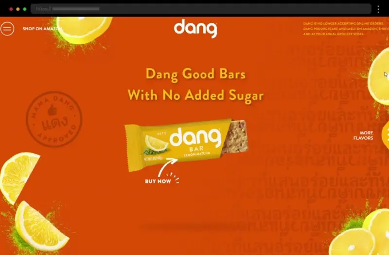 Dang Foods’ website bursts with bright oranges and teals, pairing fun visuals with clean layouts for an energetic, appetizing digital experience.