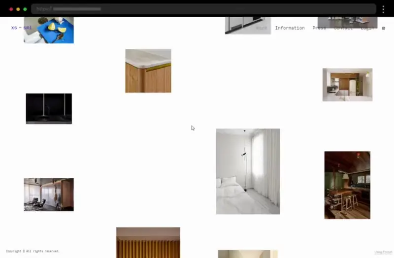 Asymmetric grids and large visuals highlight interiors with clarity. Brief text and simple project pages balance minimalism with functionality.
