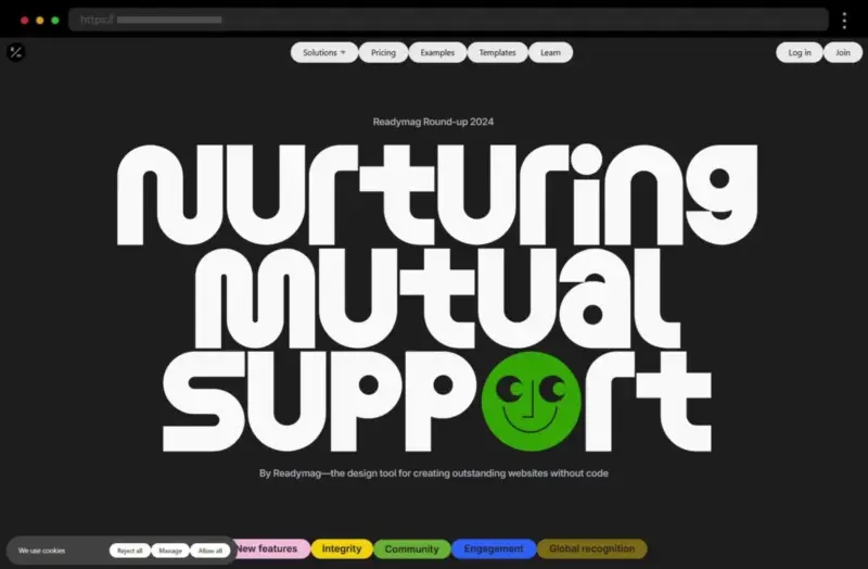 Readymag’s site is a bold celebration of typography, combining oversized vintage fonts and vibrant colors to create a visually striking and highly creative design.