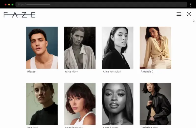 A polished, minimalistic agency portfolio featuring high-quality talent images, smooth navigation, and easy access to individual model profiles.