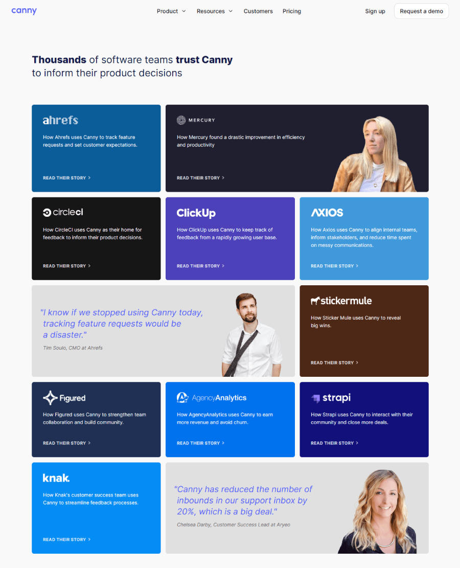 Canny transforms testimonials into colorful mini case studies. Its modular grid highlights real client results, creating an engaging, story-first experience.