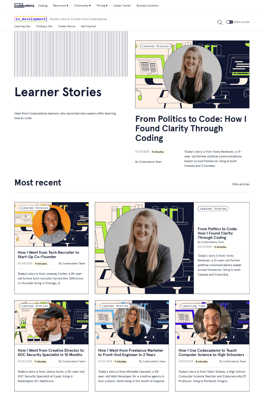 Codecademy’s “Stories” section personalizes testimonials with photos, names, and short bios. The friendly, social format makes user success feel real and relatable.