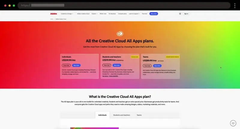 Adobe’s pricing page is clear and intuitive, offering tailored plans for different buyer types. A feature toggle and detailed FAQ make comparison and decision-making effortless.