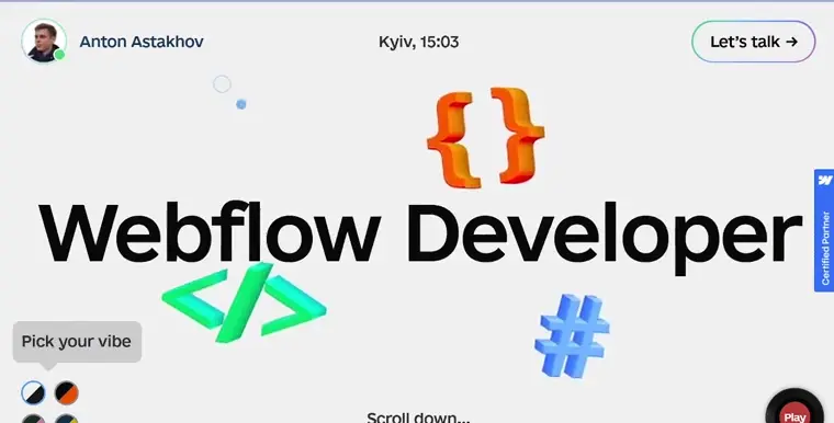 A one-page site with switchable color themes, music controls, and clear project highlights. Creative design meets functional Webflow execution.
