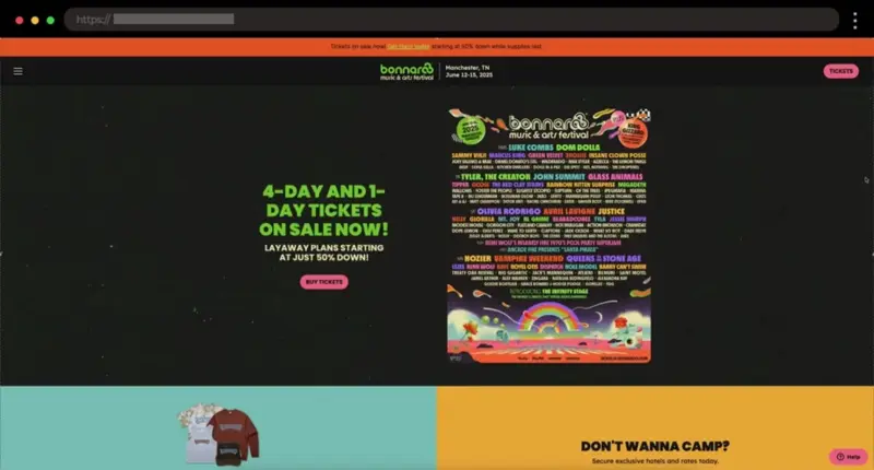 High-energy design with vibrant graphics and clear ticketing links. This festival page captures the excitement of Bonnaroo while keeping navigation simple and user-friendly.