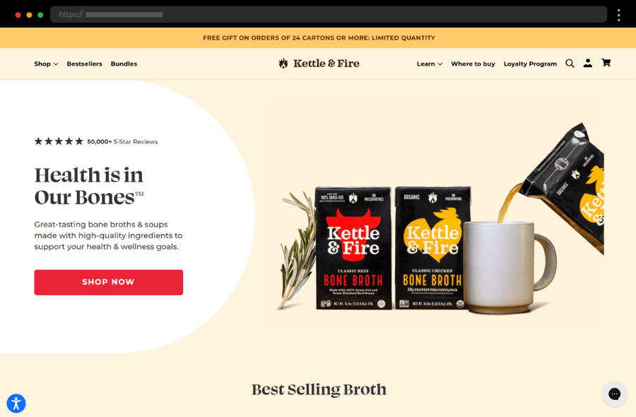 Kettle & Fire’s vibrant food company website blends appetizing visuals, warm colors, and informative content to engage health-conscious customers and boost trust.