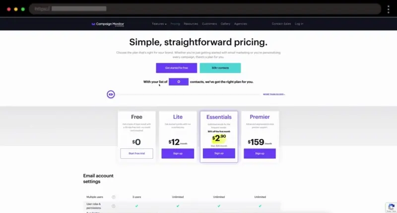 Campaign Monitor keeps it simple yet smart with a slider that adjusts prices based on contact count. Hover tips and concise feature lists enhance usability.