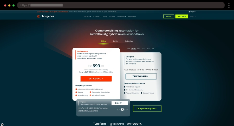 ChargeBee’s layout draws attention with standout plan boxes and multi-currency support. Clear summaries, comparison pop-ups, and social proof inspire trust and clarity.