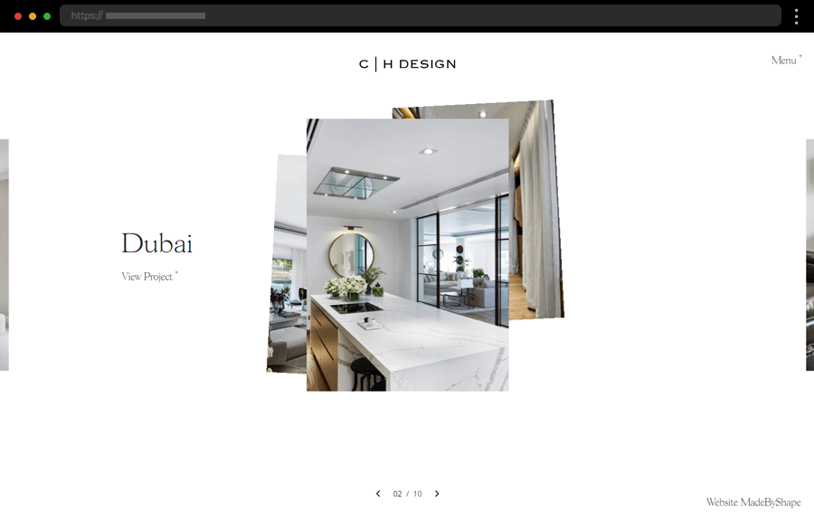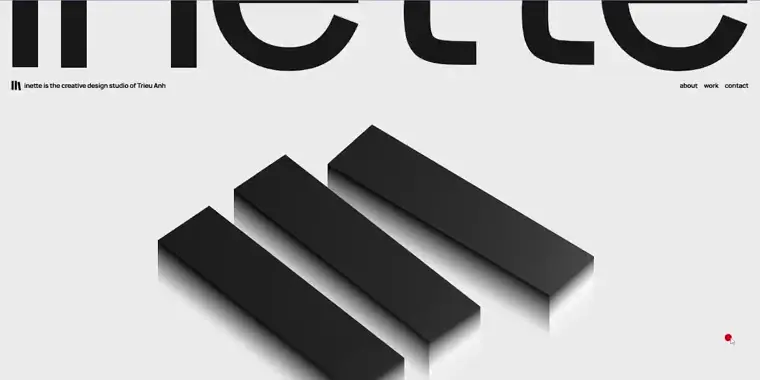 A sleek, presentation-style layout with featured works and discreet navigation creates a polished, modern portfolio experience.