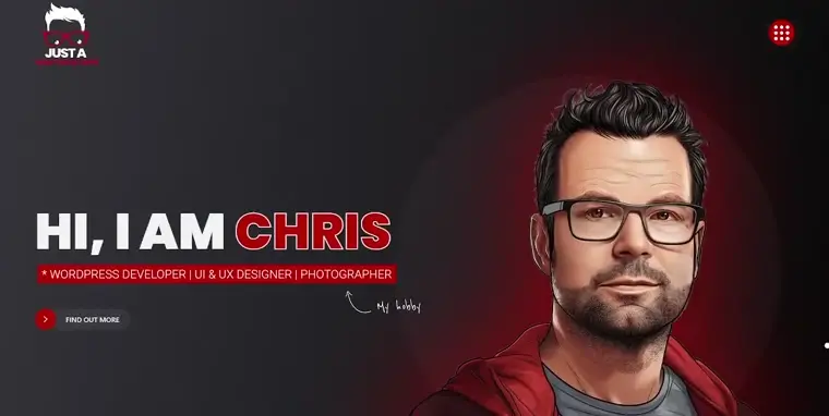 A bold black-and-red theme with playful illustrations and a hero self-portrait makes Chris’s portfolio lively and personal, with smooth scrolling and a full-screen menu for easy navigation.