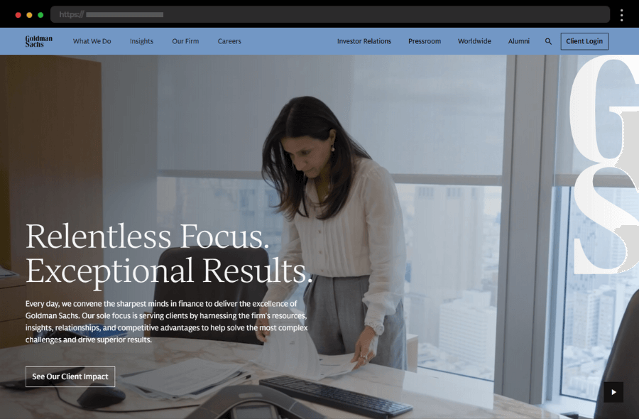 Goldman Sachs’ sleek corporate website uses bold typography and elegant visuals to present financial expertise with authority and intuitive user flow.