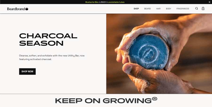 Beardbrand keeps it sharp and minimal with a clean hero, featured products, and blog highlights. Smart structure makes the simple layout feel full and polished.