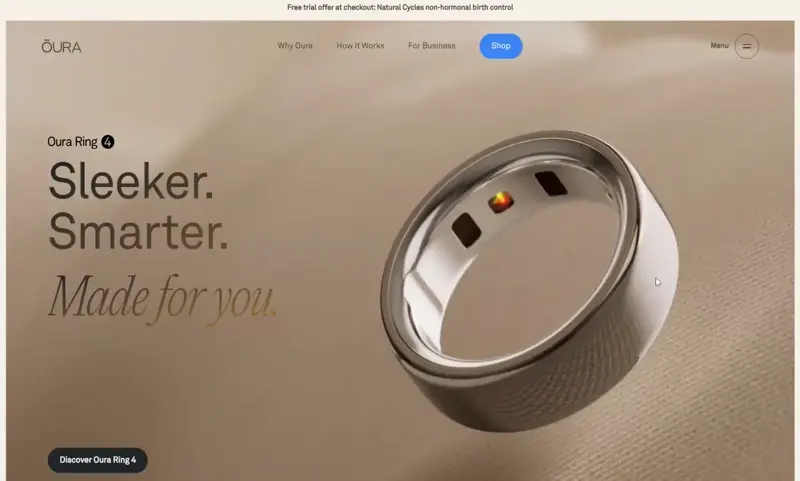 Oura’s homepage feels sleek and premium with oversized product imagery and smooth lazy scrolling. The grid layout and modern design showcase the ring’s high-tech features.
