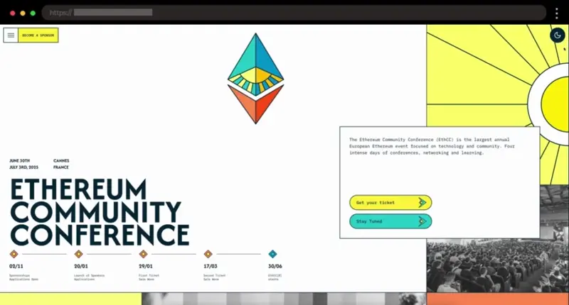 A fresh, multi-color event page with clean fonts and intuitive navigation. Quick access to tickets, sponsors, and FAQs makes it a model landing page for blockchain conferences.