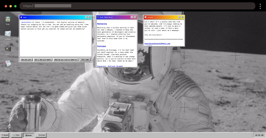 Heather Vandervecht’s site brings 90s nostalgia to life with a Windows-style interface, cosmic background, and playful interactive elements that blend retro fun with a modern twist.