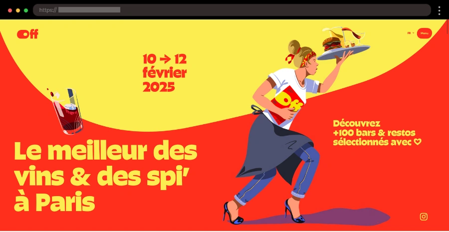 Le OFF Paris blends wine culture with bold vector art, featuring quirky illustrations, vibrant colors, and an interactive restaurant map that make the site visually engaging and fun.