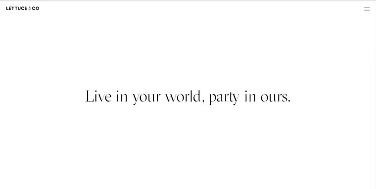 Lettuce & Co blends whimsy with minimalism, using black-and-white tones, playful pops of red, and large event images for a fun, professional look.