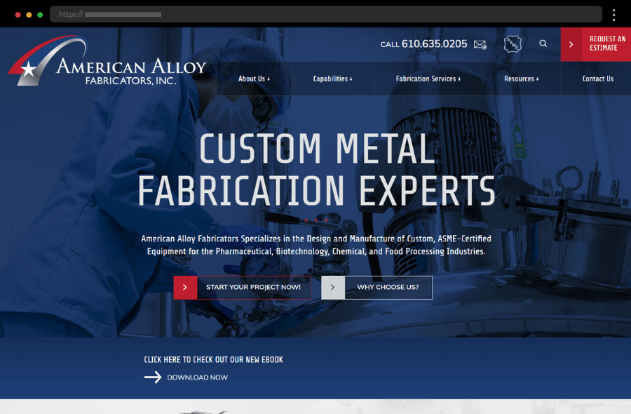 American Alloy Fabricators’ professional website highlights precision metalwork and industry expertise through clean design, clear navigation, and trust-building visuals.