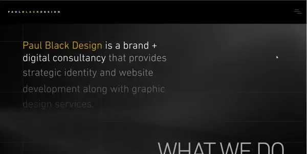 Minimal black header with a hamburger menu that slides open dynamically, combining branding and creativity in one smooth motion.