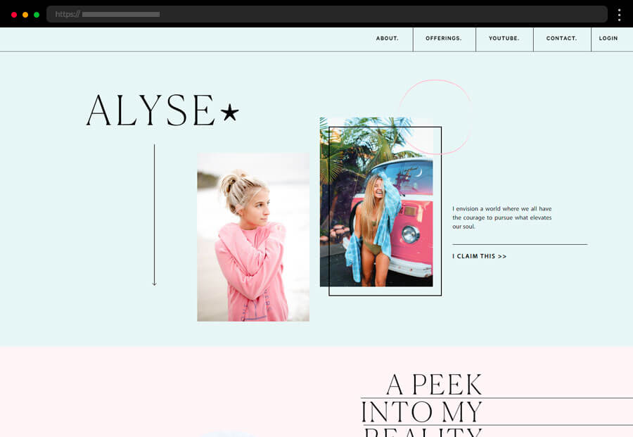 Creavora’s elegant WordPress blog example balances a simple 3-column grid with pastel-toned imagery against a dark background, plus a call-to-action for freebies.