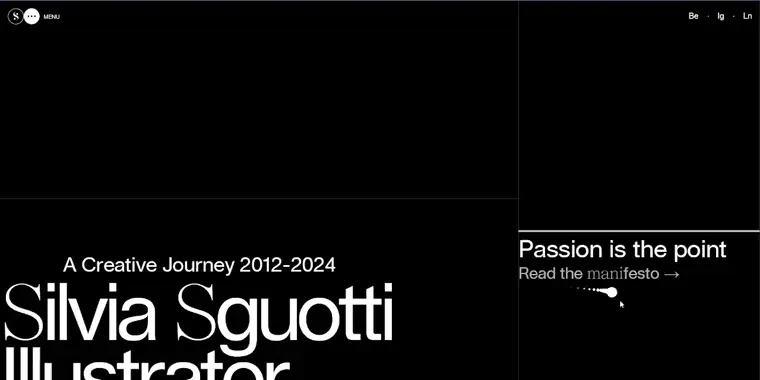 Silvia Sguotti’s horizontal portfolio pairs a minimalist black-and-white palette with bold yellow accents and large typography, creating a clean, modern, and dynamic browsing experience.
