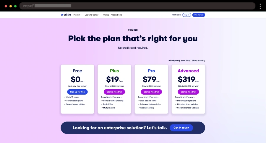 Wistia’s bright, purple-themed design makes pricing fun and easy to navigate. Simple plan descriptions, visual clarity, and FAQs help users pick confidently.