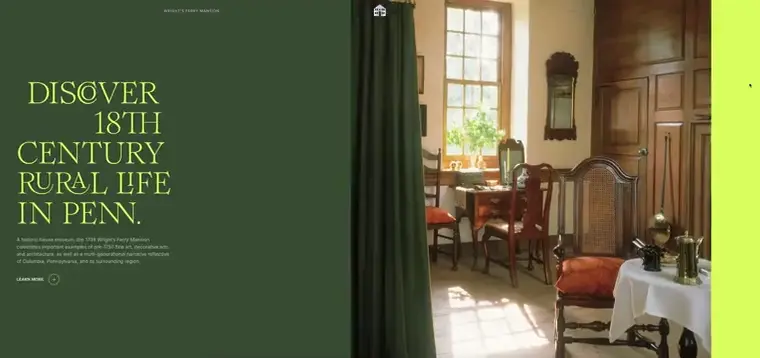Wright’s Ferry Mansion’s site captures 18th-century warmth through nostalgic tones, rich photography, and horizontal scrolling that turns history into an inviting, immersive experience.